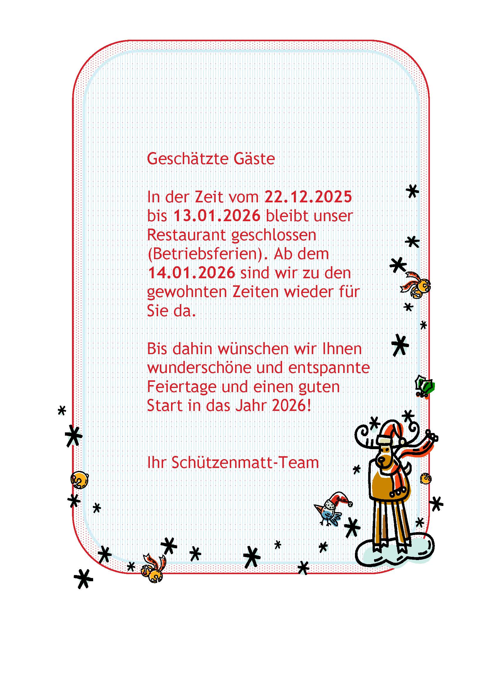 Betriebsferien: Sonntag, 21. Dezember 2025, ab 17 Uhr bis 14. Januar 2026